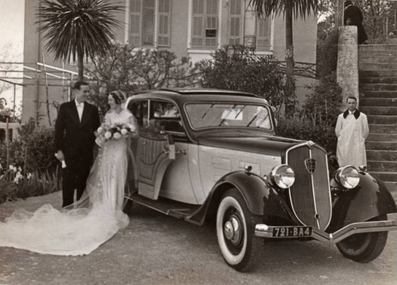 La voiture , avec ses pneus à flancs blancs , sa teinte bicolore et son chauffeur en tenue  est très élégante